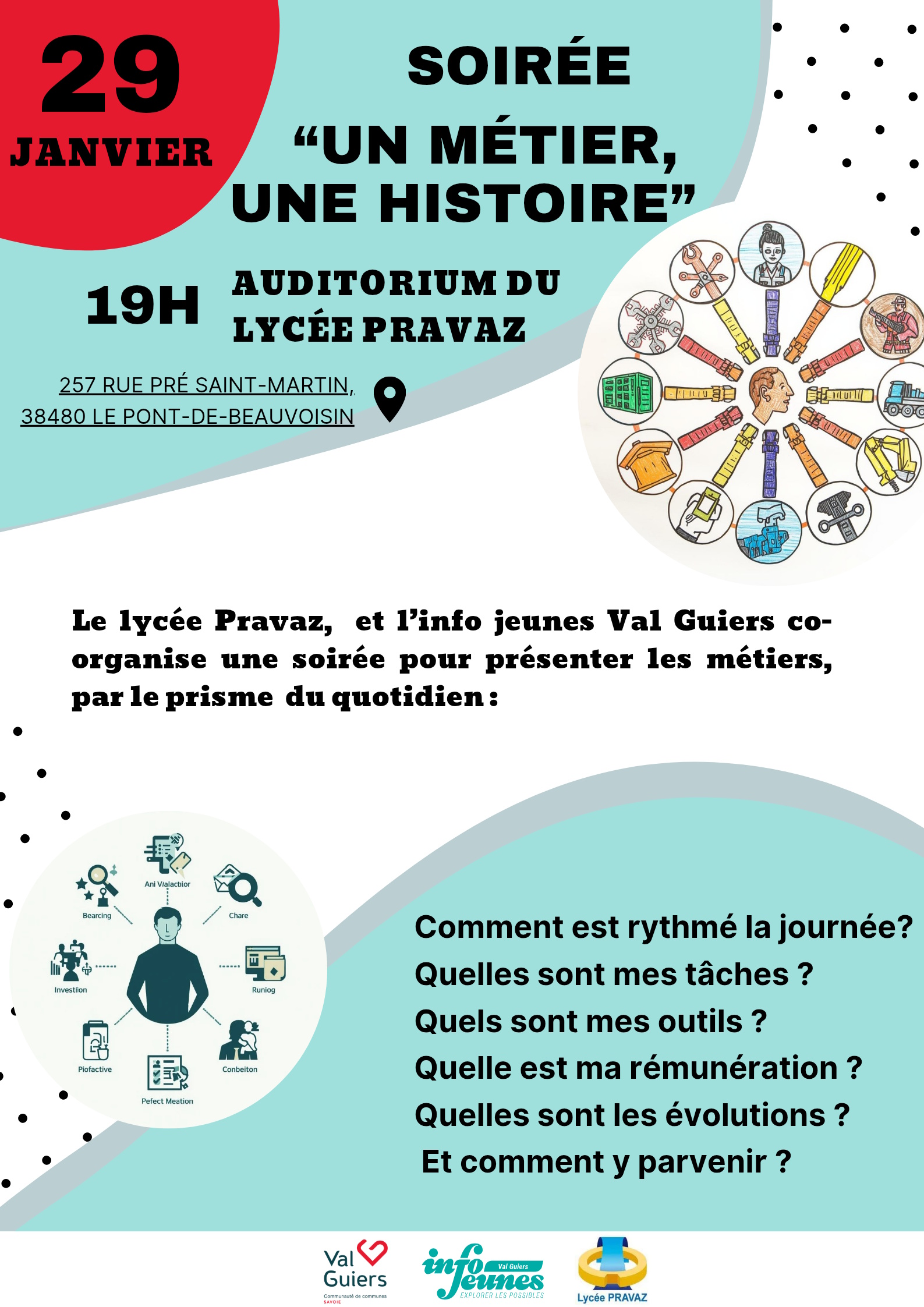 Le Bureau des Entreprises du Lycée Charles Gabriel Pravaz et le Service Info Jeunes Val Guiers s’associent pour une soirée où les métiers se racontent par le vécu, le quotidien et les vraies histoires.